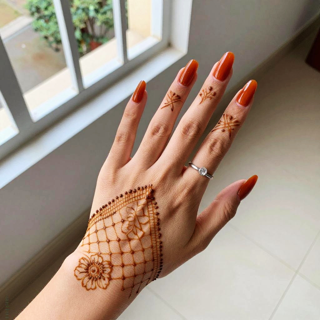 Photograph of a light-skinned hand with long, almond-shaped, nude-colored nails. The hand is adorned with intricate, dark brown henna patterns covering the fingers and palm, featuring floral, paisley, and geometric designs. The background is slightly blurred, showing a beige chair and a white plate on a reflective surface. The henna designs are detailed and symmetrical, giving a elegant and artistic look.