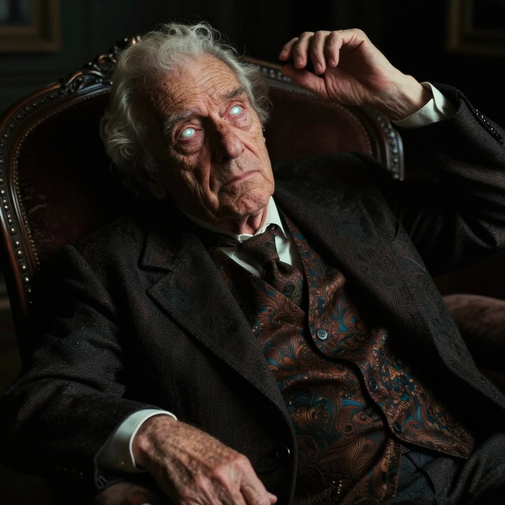Glamour portrait shot (from above:0.5) of rich sophisticated old european in fancy clothes, ((overwhelming fatigue)), wrinkles of age, photorealistic, moody colors, gritty, masterpiece, best quality, (intricate details), (****), eldritch, glow, glowing eyes, (volumetric lighting), unique pose, dynamic pose, dutch angle, 35mm, anamorphic, lightroom, cinematography, film grain, HDR10, 8k hdr, Steve McCurry, ((cinematic)), RAW, color graded portra 400 film, remarkable color, raytracing, subsurface scattering, hyperrealistic, extreme skin details, skin pores, deep shadows, contrast, dark theme