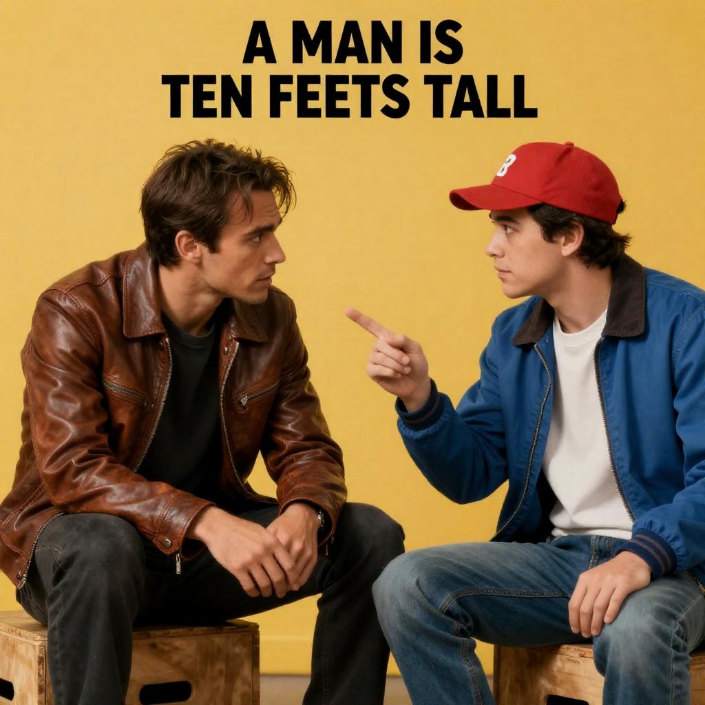 Photograph of a movie poster featuring two men. The man on the left, with dark hair and a brown leather jacket, sits with a focused expression. The man on the right, wearing a red cap and blue jacket, points at the seated man. They sit on a wooden crate against a yellow background. The poster reads "A MAN IS TEN FEET TALL."
