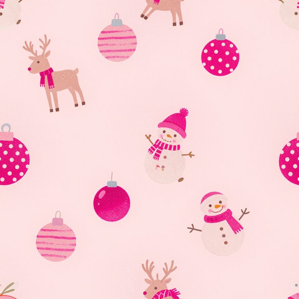 Preppy Christmas wallpaper pink showcasing a blend of soft rose hues and bright fuchsia, decorated with quirky Christmas icons like reindeer wearing scarves, polka dot ornaments, and whimsical snowmen, highlighted by subtle glitter effects for a charming seasonal design.