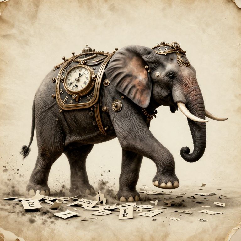 Digital artwork of a majestic, golden-ornamented elephant with a clock on its side, standing on a gold staircase amidst clouds.