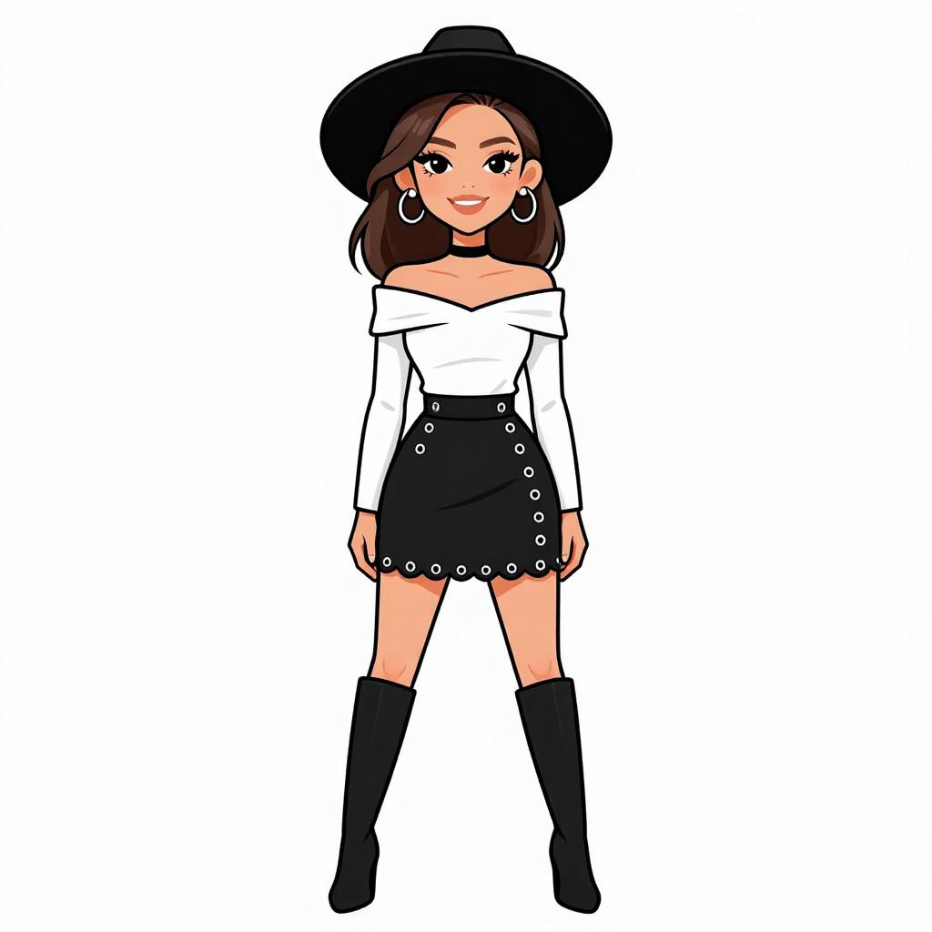 Digital drawing of a young woman with fair skin and straight brown hair, wearing a black beret, round black sunglasses, a black short-sleeved top, a high-waisted maroon skirt with buttons, and black knee-high boots. She stands against a white brick wall, her arms relaxed by her sides. The style is simple and cartoonish, with bold black outlines and flat colors, emphasizing her chic, stylish appearance. The background is minimalistic, focusing attention on the character.