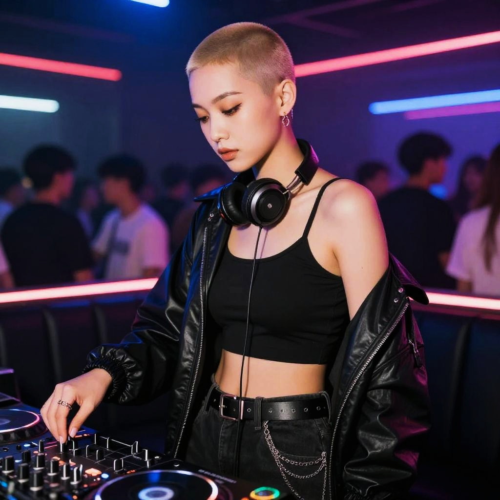 Textured Layers hairstyle on female DJ, wearing futuristic metallic jacket and pants, in nightclub dance floor, captured in fashion editorial style with neon colored lights.