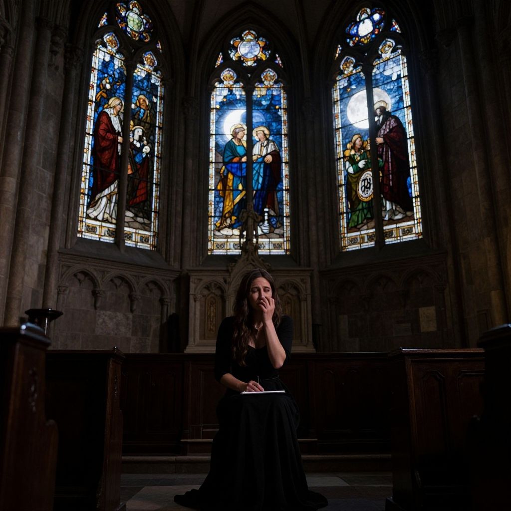 Photograph of a dimly lit, Gothic-style church interior. A young woman with long brown hair, dressed in a black, long-sleeved dress, sits in the foreground on a wooden pew, her hand covering her mouth in a contemplative gesture. She is illuminated by the vivid, colorful stained glass windows behind her, which depict religious scenes with figures in blue and red robes. The stone walls and wooden pews frame the scene, creating a contrast between the dark, shadowy interior and the bright, detailed stained glass. The overall mood is somber and reflective.