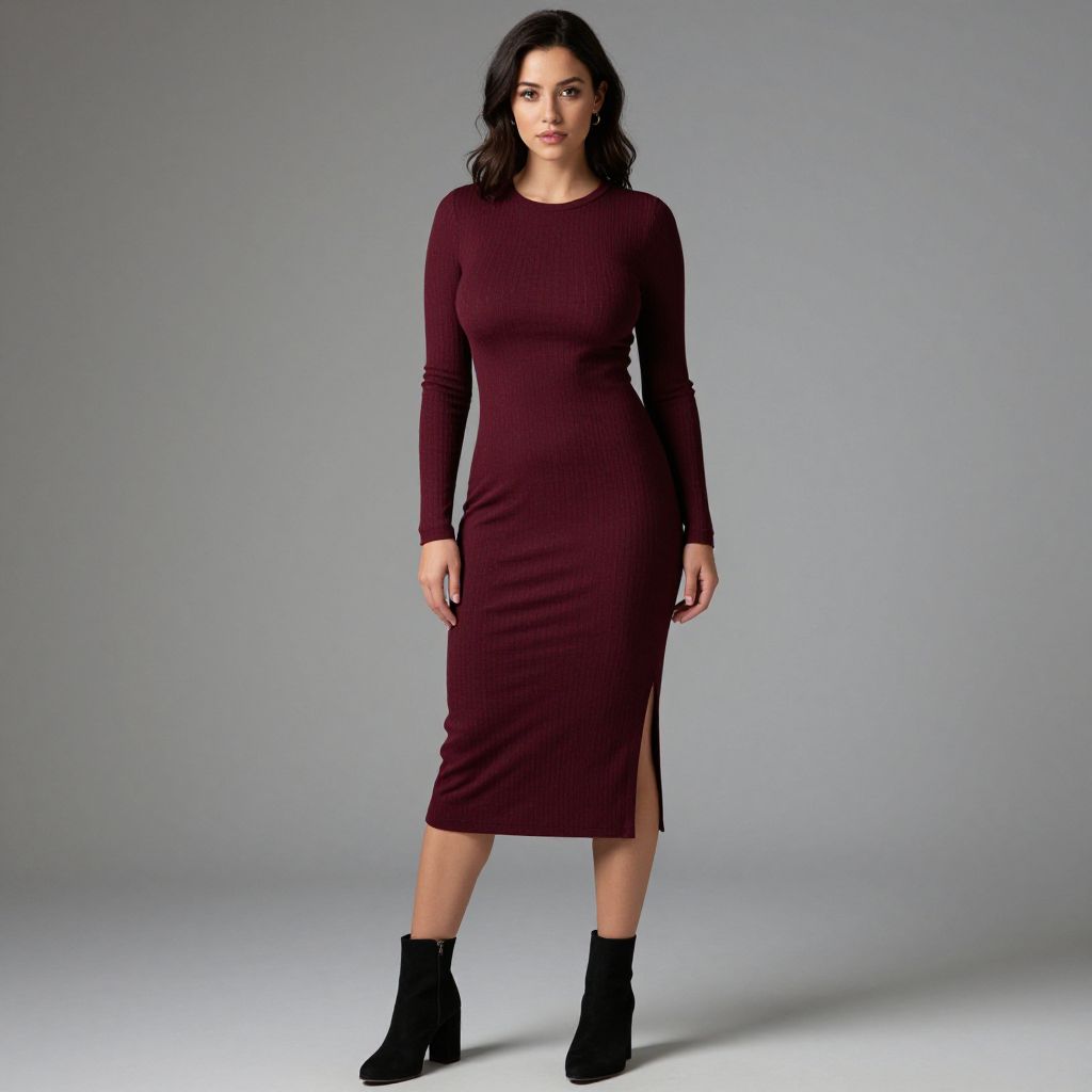 Photograph of a young woman with medium-dark skin and wavy black hair, standing against a plain gray background. She is wearing a fitted, long-sleeved, dark burgundy dress that reaches mid-calf, and black ankle boots. Her expression is neutral, and she stands with her arms relaxed by her sides. The dress has a subtle sheen and a slight slit on the left side. The lighting is even, highlighting the simplicity and elegance of her outfit.