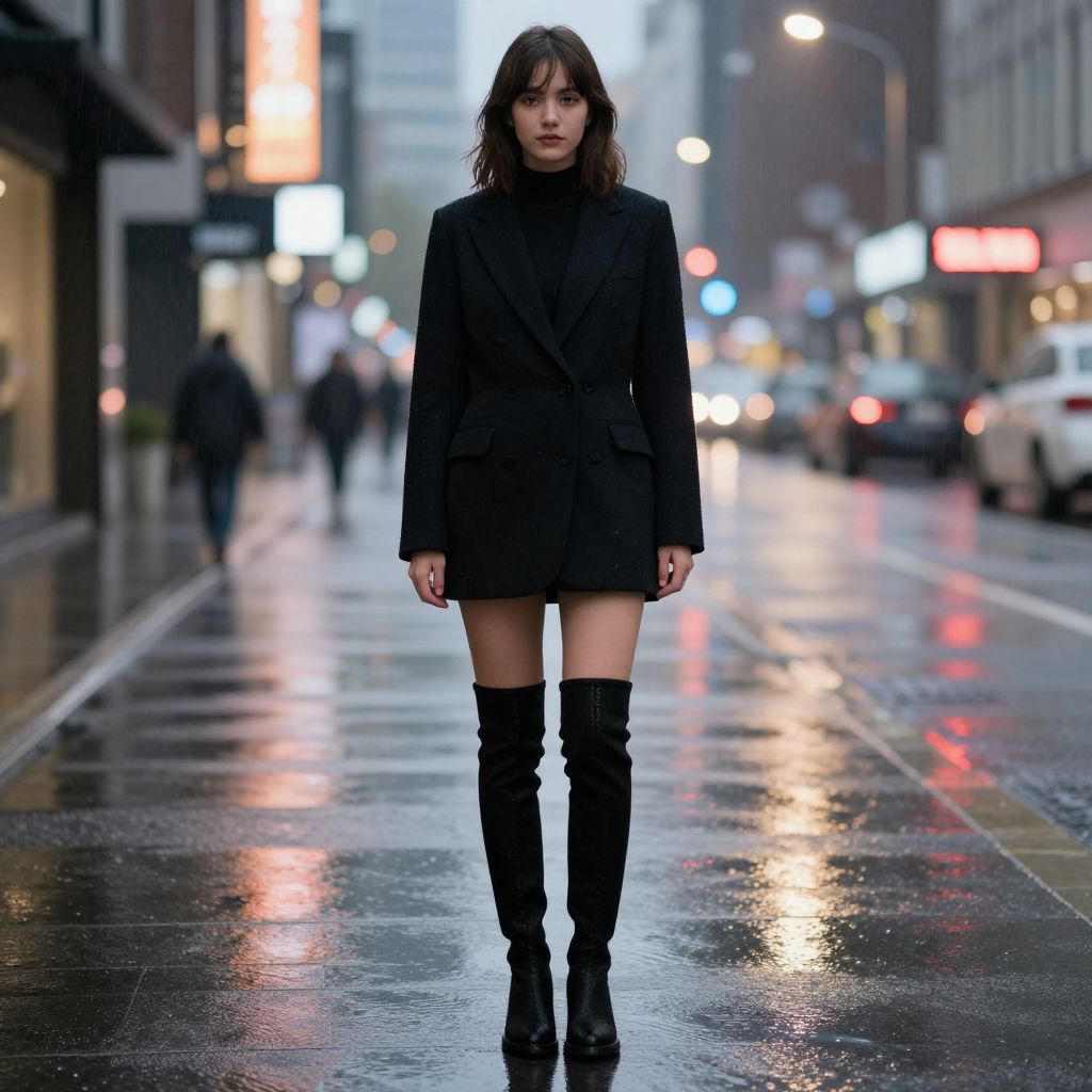 A young woman with warm brown eyes and soft brown hair stands confidently in a rainy city street, her feet tucked into sleek black thigh high boots, the wet pavement reflecting the neon glow of streetlights in the background, raindrops sliding down the boot shafts.