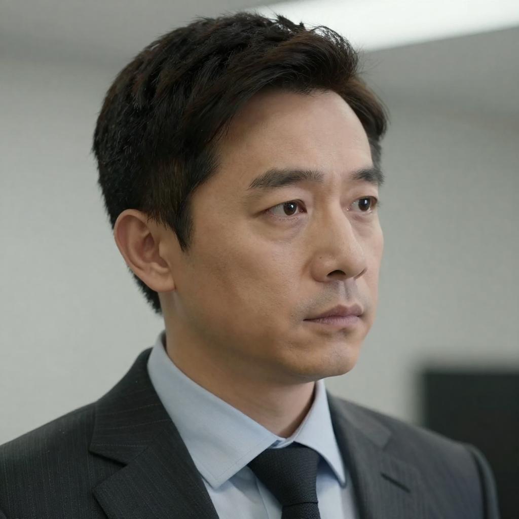 A confident man stands in a serene park setting, surrounded by lush greenery. His polished look, featuring a navy polo shirt, enhances the relaxed yet sophisticated atmosphere of the scene.