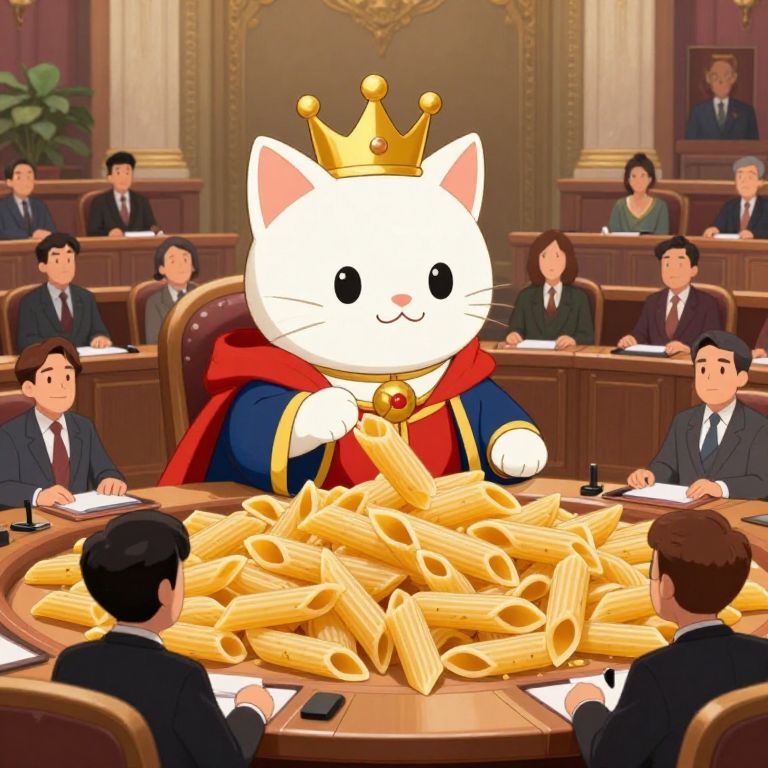 A crowned cat-queen rules over a parliament of penne pasta, each noodle-politician voting with rotations of its spiral-facing side.