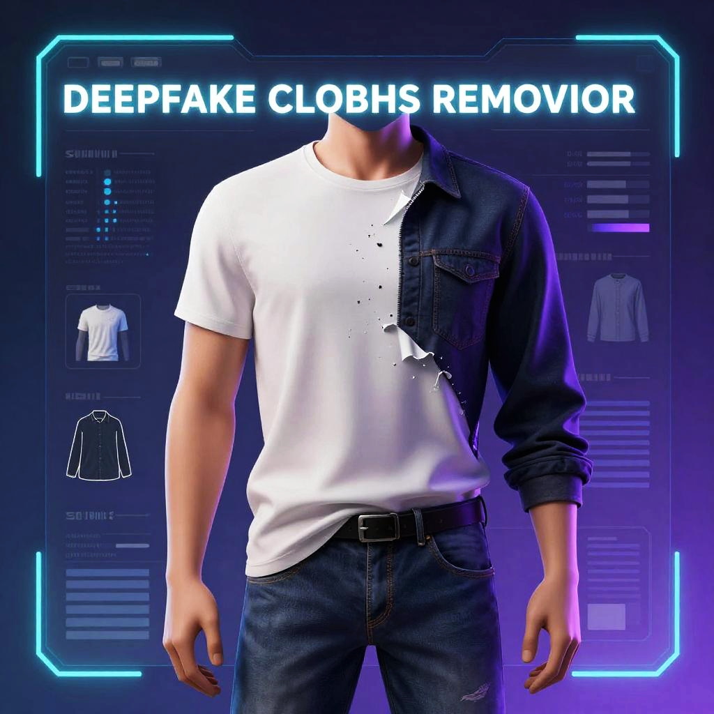 Illustration of deepfake clothes remover software showing virtual clothes peeling off from a realistic 3D model, digital interface with glowing blue and purple light effects, sleek futuristic design, high detail, sci-fi theme