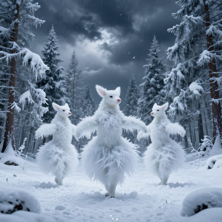 In a forest of frozen time, animals made of icicle and snowdream wake periodically to dance under silent thunderstorms.