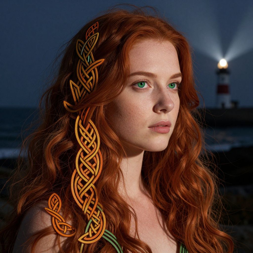 A portrait photograph depicts a young woman with cascading red hair and striking green eyes, seamlessly intertwined with intricate Celtic knotwork patterns. The vibrant lines of the knotwork meander through her locks like vines, creating a captivating visual tapestry that symbolizes nature's beauty and humanity's enduring spirit. Illuminated by the distant lighthouse's beams, her expression exudes contemplative serenity amidst dramatic shadows that enhance the interplay between organic curves and abstract design. This dual imagery of knotwork and feminine grace forms a harmonious visual symphony, embodying the eternal dance of order and chaos within human existence.