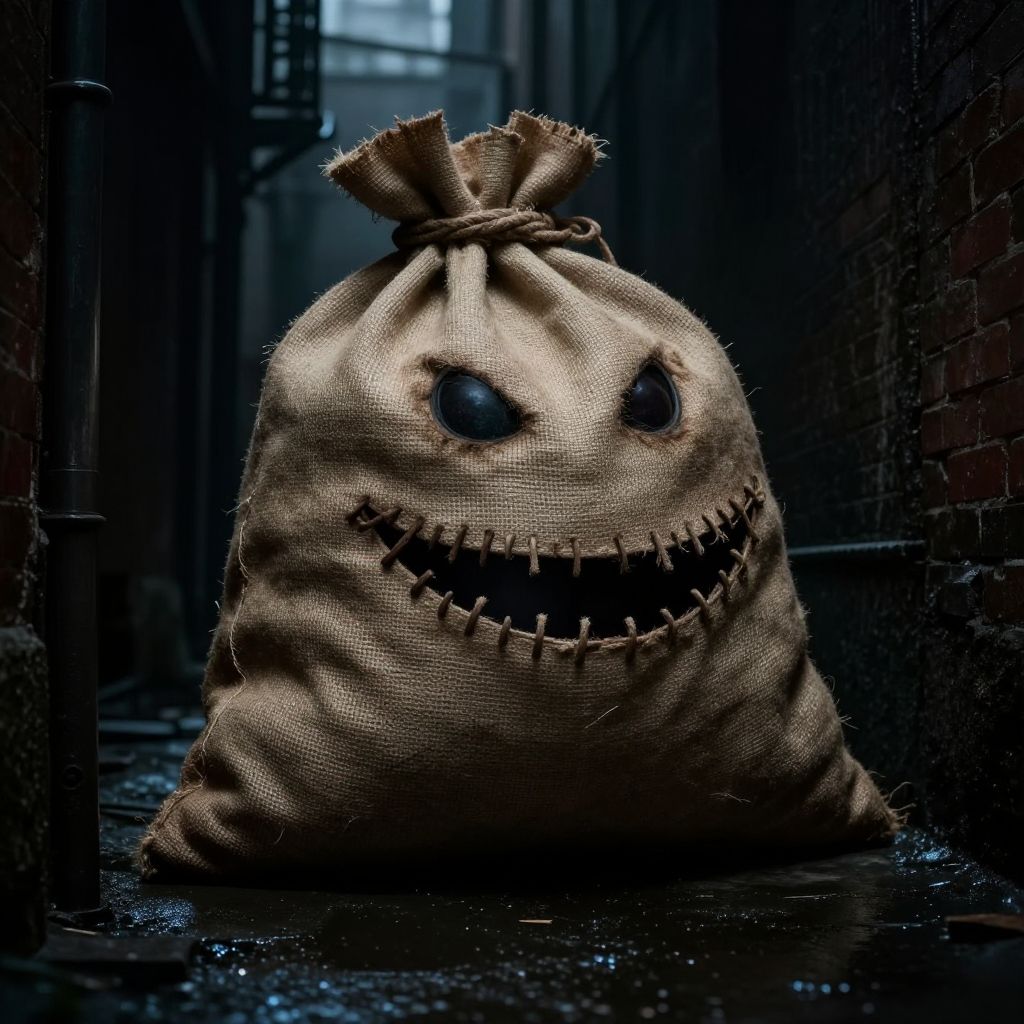 Sack monster emerging from a shadowy alley, oversized stitched mouth, rough burlap skin, ominous glowing eyes, wet pavement reflections, urban dark fantasy, dramatic angles