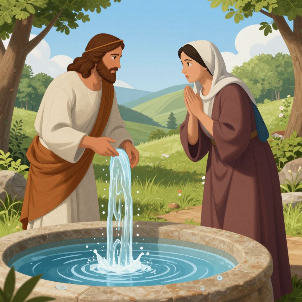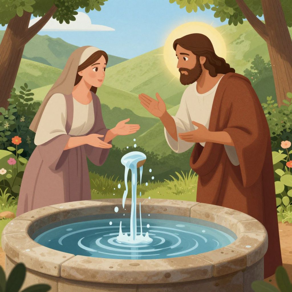 A serene digital illustration depicts Jesus and a Samaritan woman engaged in a profound conversation by Jacob's Well, where cascading living waters symbolize spiritual transformation, rendered in vibrant, high-definition detail with naturalistic lighting and a harmonious blend of realism and symbolic artistry.