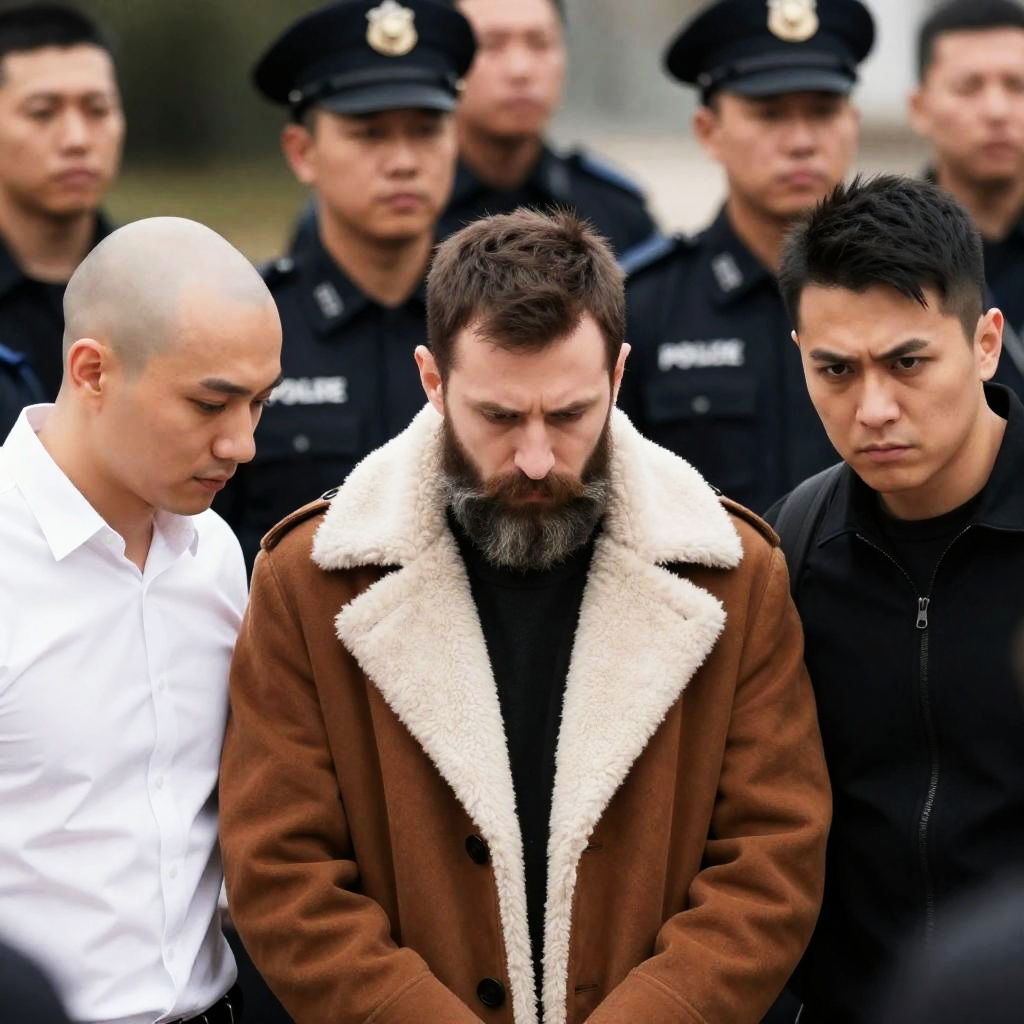 Photograph of three men in the foreground, surrounded by a group of people in the background. Center man with brown coat, white fur collar, and gray beard leans forward. Left man bald, wearing white shirt, looks downward. Right man with short dark hair, black shirt, intense expression. Police officers in black uniforms stand in the background.