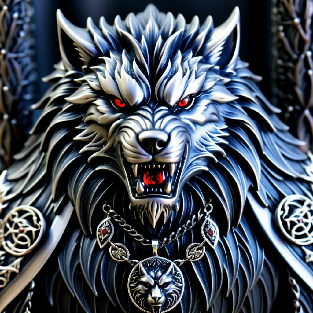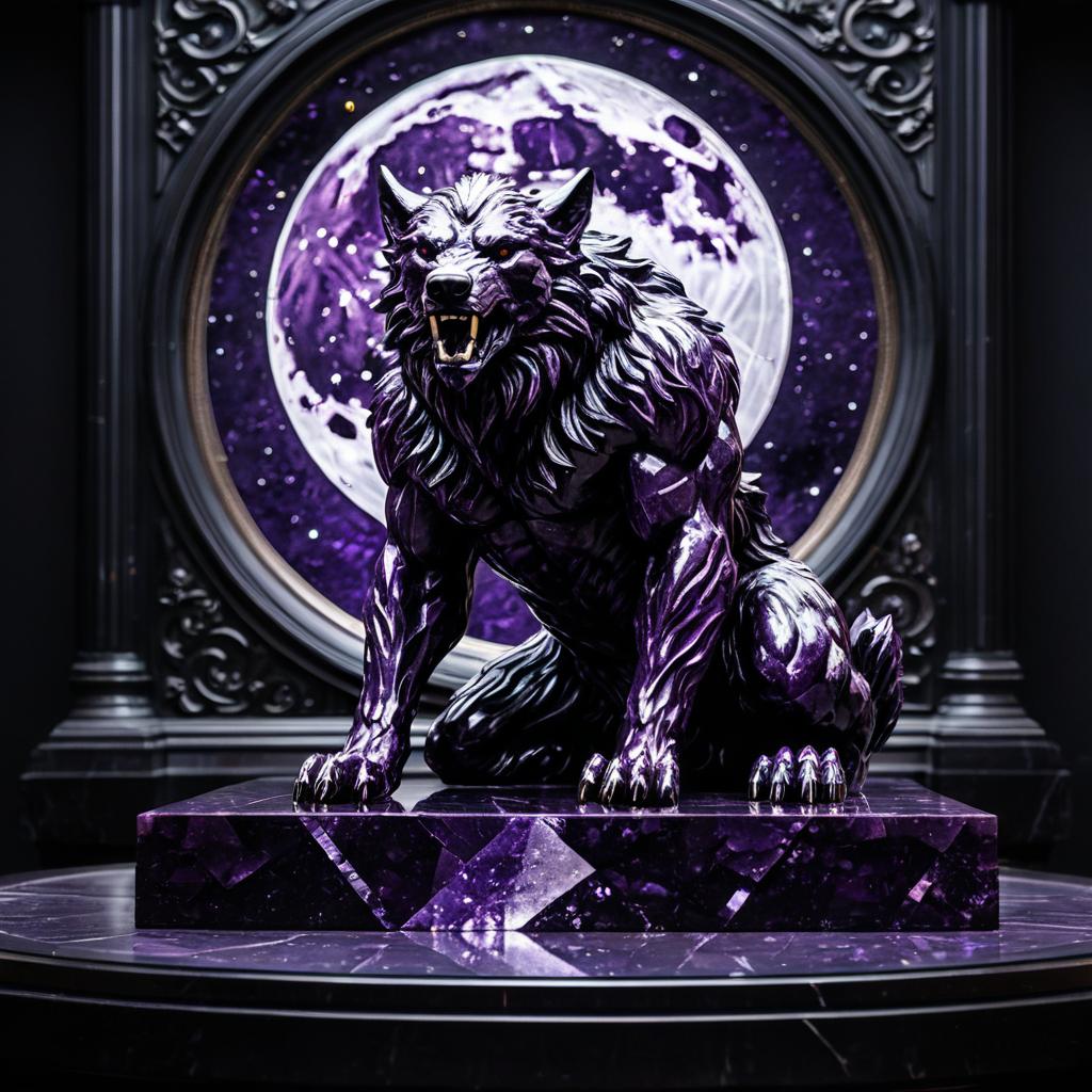 A detailed obsidian statue of a snarling werewolf, intricately inlaid with deep amethyst. The statue is set against a large, circular backdrop featuring a glowing full moon with a cosmic purple background, adding a surreal and mystical atmosphere. The dark, reflective surface of the obsidian contrasts with the vibrant purple amethyst accents, emphasizing the statue's muscular form and fierce expression. Inspired by the style of Zdzisław Beksiński, the composition blends surreal elements with a sense of depth and mystery.
