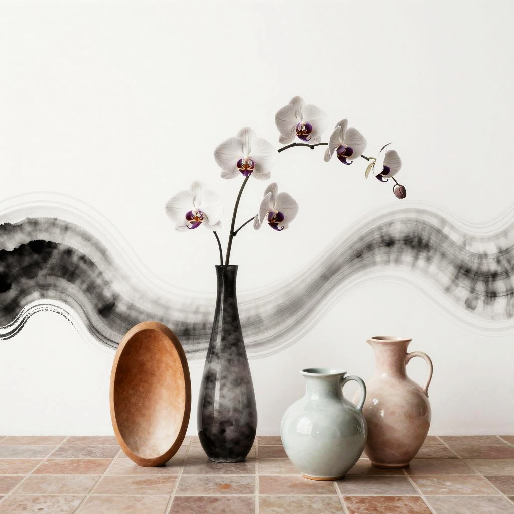 An ink wash art with fluid gradients and soft lineart of orchids floating in an obsidian tapered vase with earth-toned oval planters and glazed pastel jugs. Set against monochromatic gray waves and swirling lines atop a muted terracotta tiled floor on a tiled floor. Playful modern still life, Memphis-inspired geometry, saturated yet balanced color, clean negative space, high detail, crisp edges, soft studio lighting, cohesive composition.