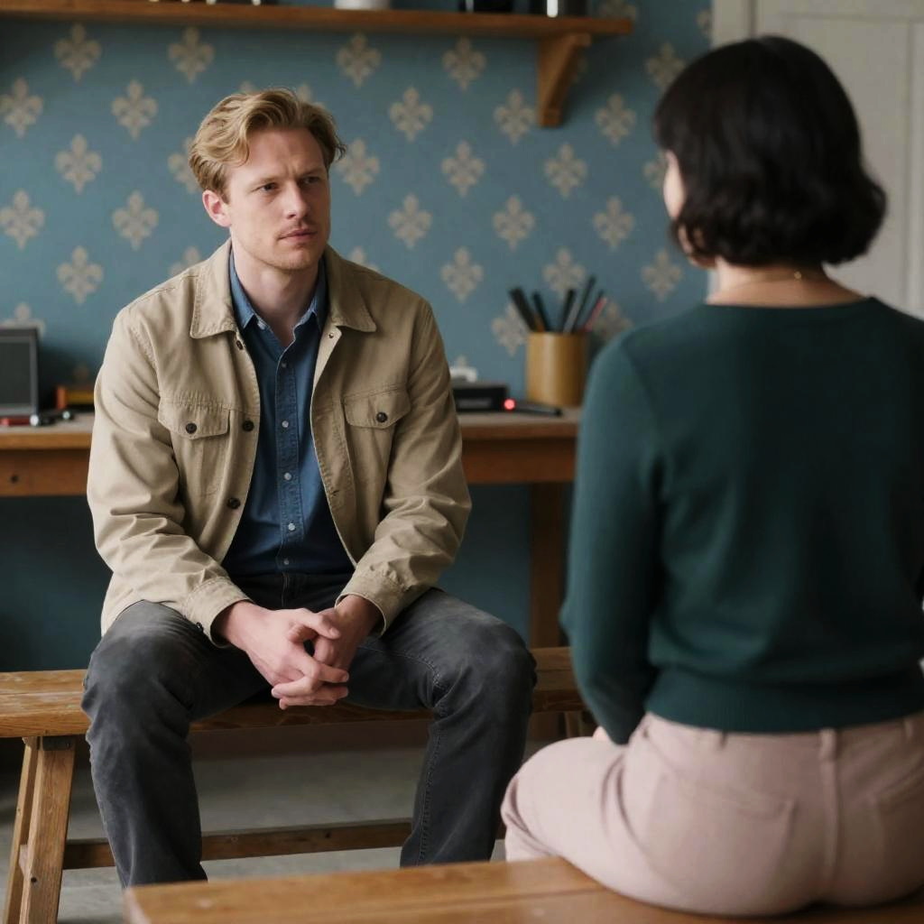 Photograph of a man with blond hair, smiling widely, wearing a blue and beige zip-up jacket, sitting on a beige patterned couch, facing another person with glasses, blurred in the foreground. Dimly lit room in the background.