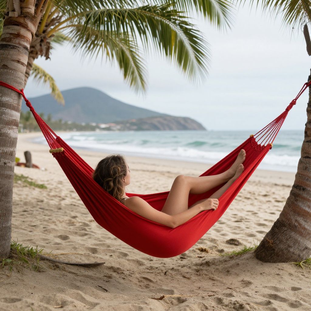 Relaxed woman lounging in a vibrant red hammock on a sandy beach in Ecuador, surrounded by palm trees and overlooking the tranquil ocean with distant mountains in the background.