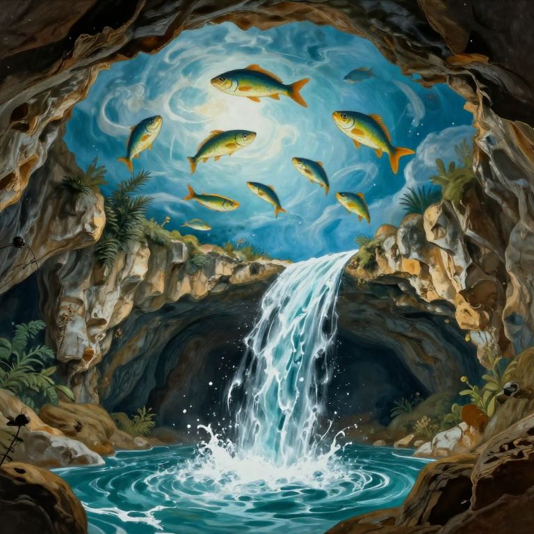 A vibrant digital painting depicts a cave with a cascading waterfall into a blue, rippling pool. Above, bright sunlight illuminates seven colorful fish with yellow and orange scales, swimming in a clear, swirling blue sky. The cave's rocky walls are adorned with green ferns and plants, adding texture and depth. The waterfall creates a dynamic splash at the pool's center, contrasting with the serene, natural surroundings. The composition combines vivid colors and detailed textures, creating a fantastical, almost surreal scene.