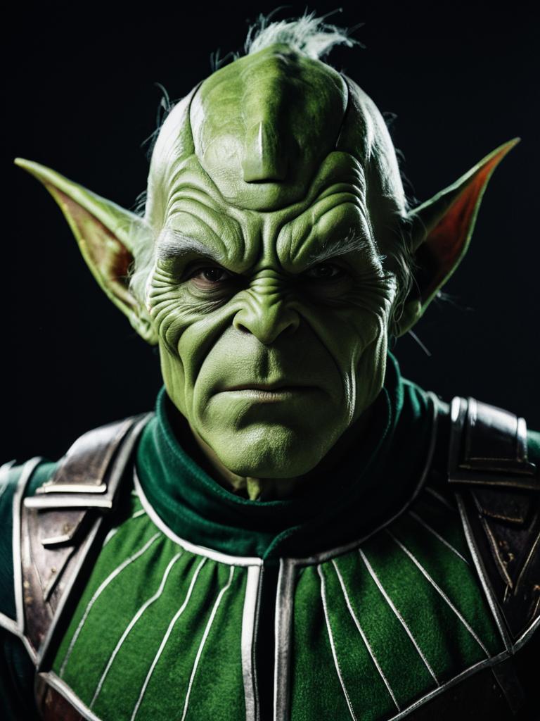 Photorealistic studio portrait of a man wearing a detailed Green Goblin costume. The subject features green, textured skin with pronounced wrinkles and large pointed ears. He is dressed in a green textured suit with black harness straps, captured against a dark background with sharp lighting highlighting the facial details.