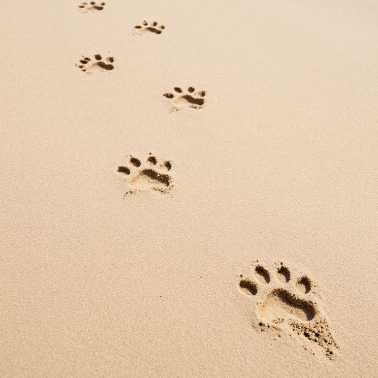 Photograph of five sets of animal paw prints in a sandy beach setting. The paw prints are evenly spaced, with the largest set of prints closest to the bottom right corner and the smallest set towards the top left. The sand is a warm, golden color, and the shadows of the prints are deep and well-defined. The texture of the sand is fine and slightly rippled, adding a sense of movement. The sunlight casts a soft, warm glow over the entire scene.