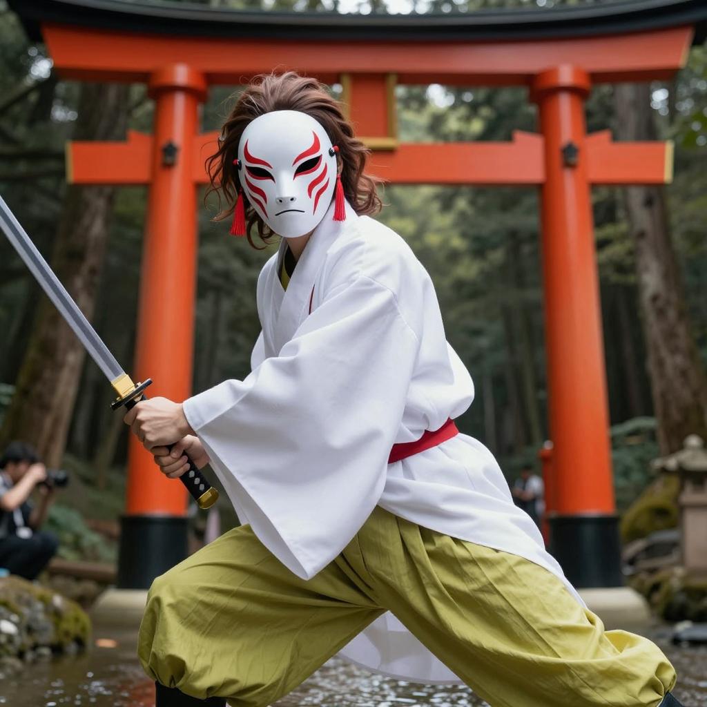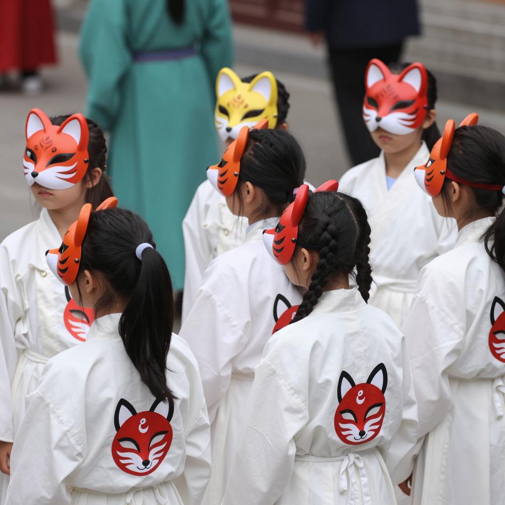 Group of seven people in black robes and wolf masks, sitting on gray tiled ground. Foreground figure crouches with mouth open, showing sharp teeth. Other figures sit behind, some looking down. Background has a large red and white banner. Wolf masks have red accents. One person in white cap sits among them.