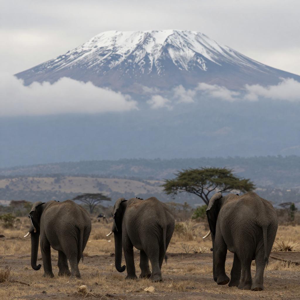 Photograph of three giraffes with tan and brown patterned coats standing in a grassy, sunlit savanna. A snow-capped mountain looms in the background, slightly blurred due to shallow depth of field. The camera angle is slightly low, capturing the giraffes from the side. Bright, natural light enhances the vivid colors and textures. The foreground is in sharp focus, while the background is softly blurred.