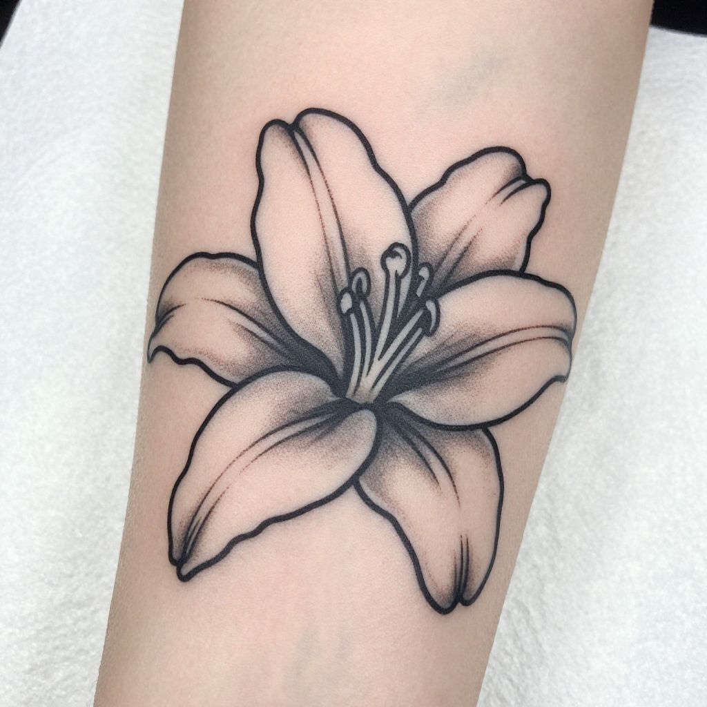 Lily tattoo stencil capturing a single large lily blossom with detailed stamen and smooth flowing petals, outlined with sharp black lines for high contrast, intended for an elegant forearm tattoo, on a clean white paper background.