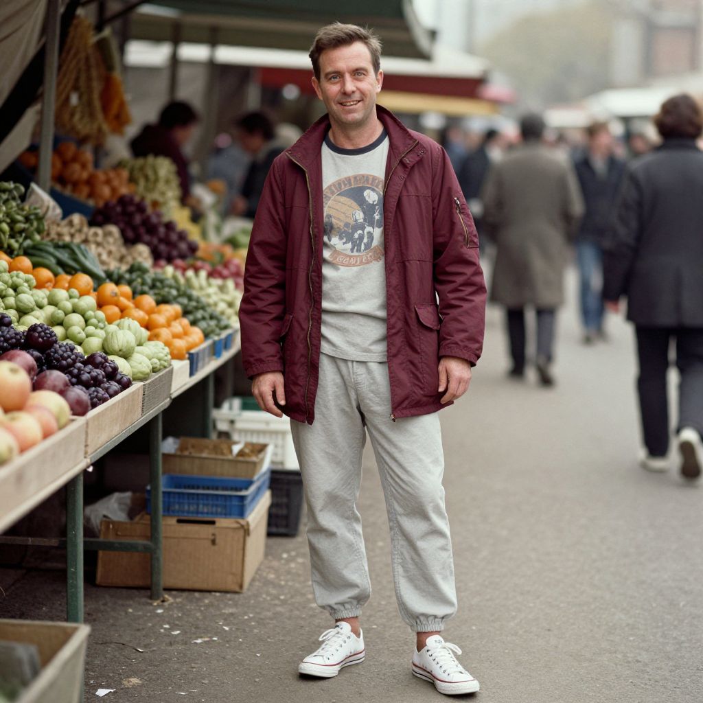A man, burgundy parka jacket, light grey jogger trousers, vintage band t-shirt, classic white low-top sneakers, relaxed silhouette, vibrant stalls, colorful produce, bustling crowds, hand-tinted photograph, cheerful expression.Man has masculine face and piercing eyes