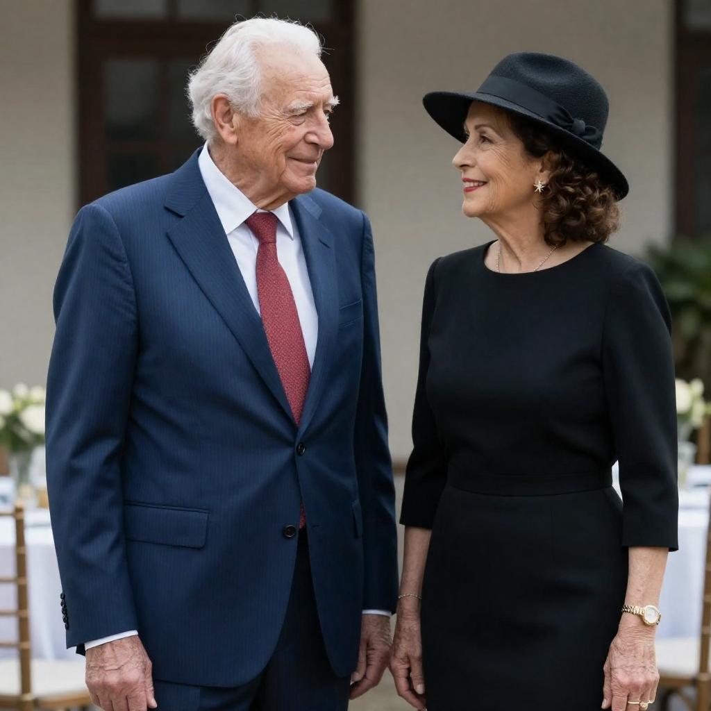Photograph of three people walking in a cemetery on a sunny day. An elderly man with gray hair wearing a black coat and tie walks in the center holding hands. A curly-haired woman in a dark coat carries a large bouquet of purple and white flowers. A young man with brown hair dressed in a black suit and white shirt walks behind them. Several grave markers and an iron fence are visible in the background.