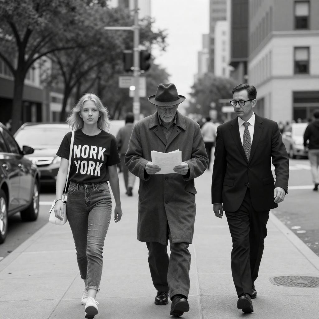 Black-and-white photo of three pedestrians walking on an urban sidewalk. Young blonde woman in casual outfit with a printed 'NEW YORK' t-shirt and white handbag. Elderly man in overcoat and hat holding papers, and a well-dressed man in a dark suit, tie, and glasses. City street setting with cars, trees, buildings, and several people in the background.