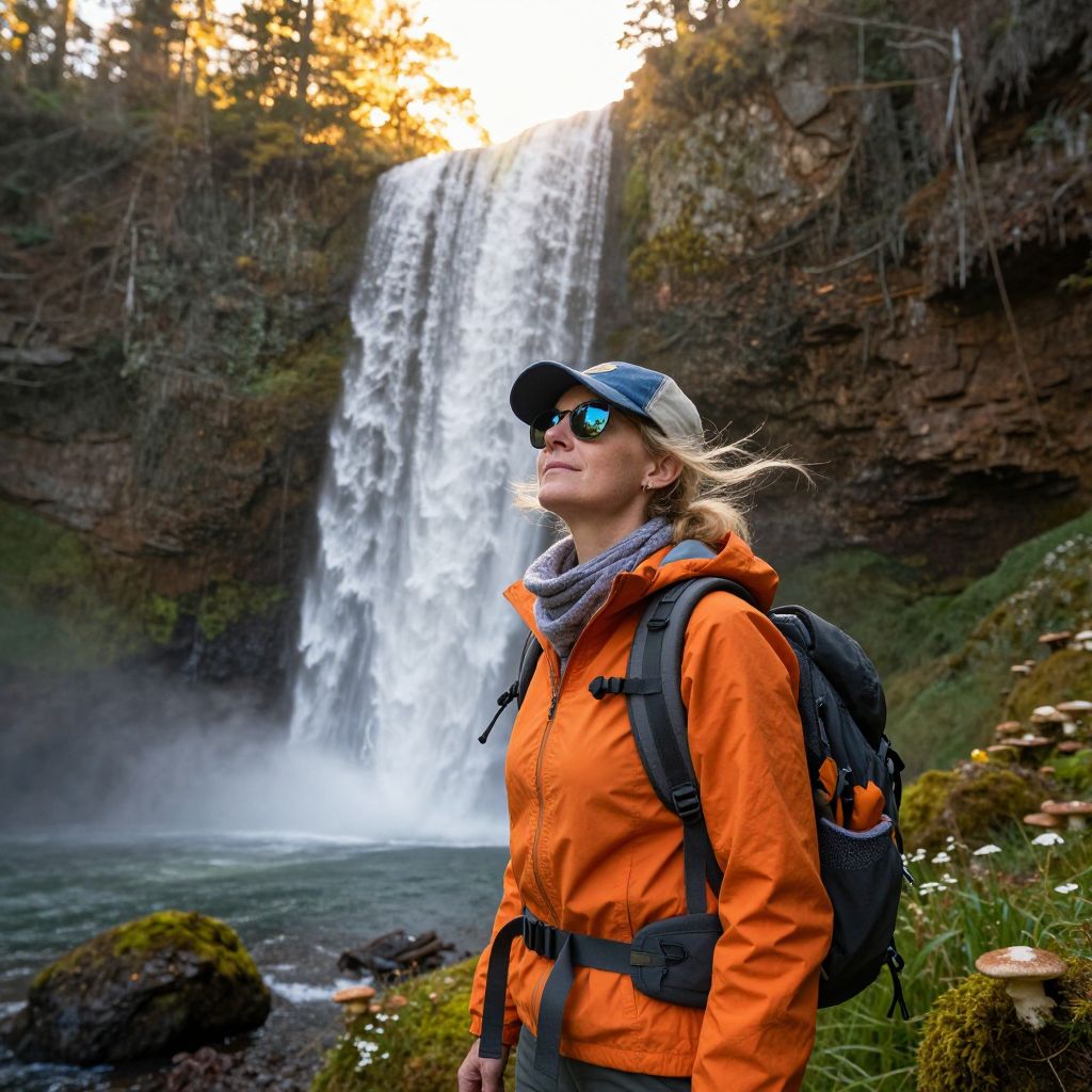 In this breathtaking image, a woman stands at the top of a lush waterfall, her gaze fixed on the cascading water below. She is dressed in hiking gear, including a vibrant orange jacket, a cozy scarf, and a practical backpack. Her cap, adorned with sunglasses, shields her eyes from the sun, while her blonde hair flows gently in the breeze. The waterfall, a stunning natural wonder, flows majestically behind her, surrounded by an array of trees, moss, fungi, and mushrooms. The scene is bathed in the warm, golden hues of the golden hour, casting a soft, inviting light over the entire landscape. The woman's face, detailed with hyper-realistic features, is a focal point, her eyes reflecting the beauty of the surroundings. The overall composition is harmonious, with the woman positioned centrally, the waterfall to her left, and the verdant landscape stretching out in all directions. The interplay of colors, textures, and shapes creates a vivid, immersive experience, capturing the essence of a serene, adventurous moment in nature.