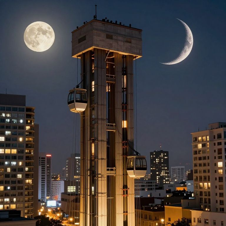 Elevators suspended by intricate cables float gracefully above a bustling cityscape, illuminated by warm lights against a backdrop of a luminous full moon and a crescent moon, creating a surreal blend of futuristic architecture and celestial beauty.