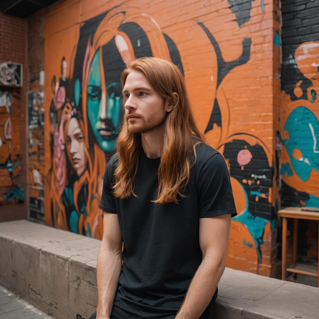 A wide shot showing the subject interacting with furniture. The subject features bright copper-colored long hair with blunt ends. A calm, serene gaze is captured. The subject wears a simple fitted black t-shirt. The background is a vibrant mural wall in an alley. Natural daylight lighting, depth of field, photorealistic, 8k, highly detailed hair texture.