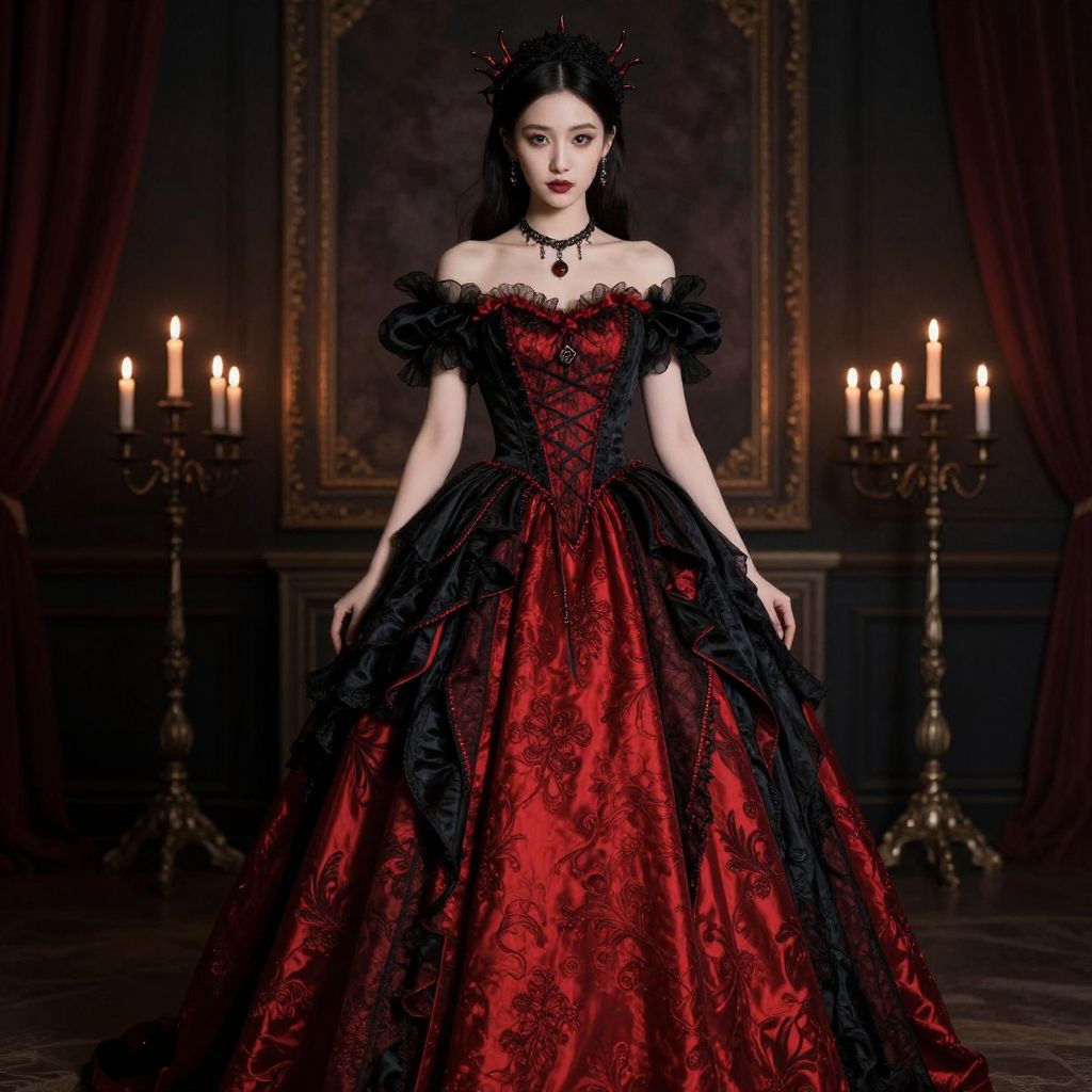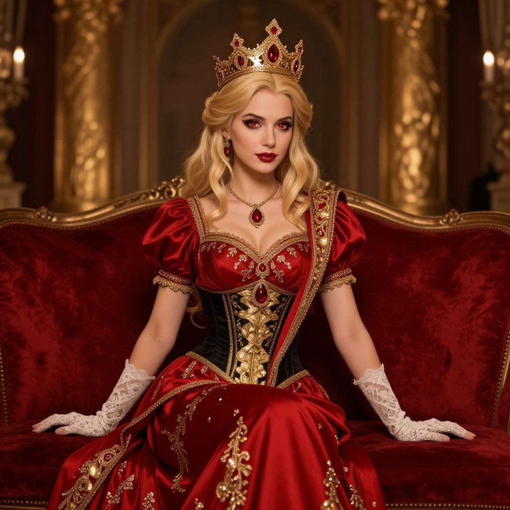 Elegant woman with red eyes in a luxurious crimson gown, standing in an ancient library filled with mystical tomes, warm golden lighting and intricate details