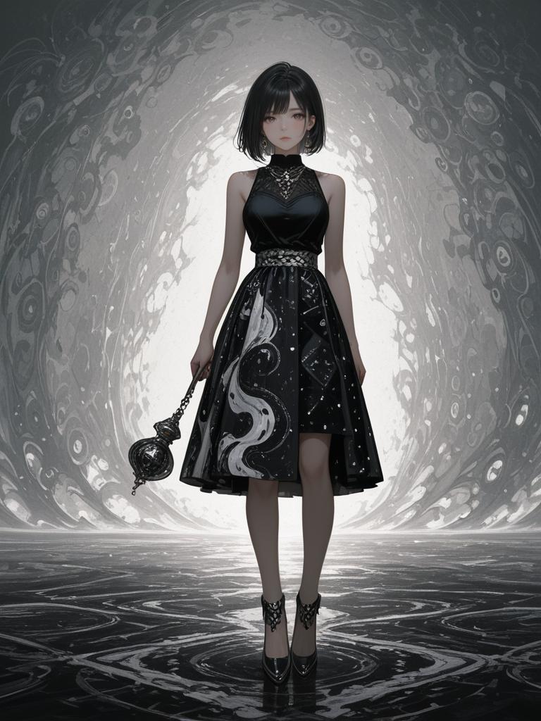 Full body portrait of a woman with short black hair wearing a sleeveless black top with an embellished crew neck and a black and white abstract print mini skirt featuring an asymmetrical hem. She holds a metallic clutch and stands against a swirled, abstract background with dark and white tones. The image has a realistic style with a focus on elegant evening wear.