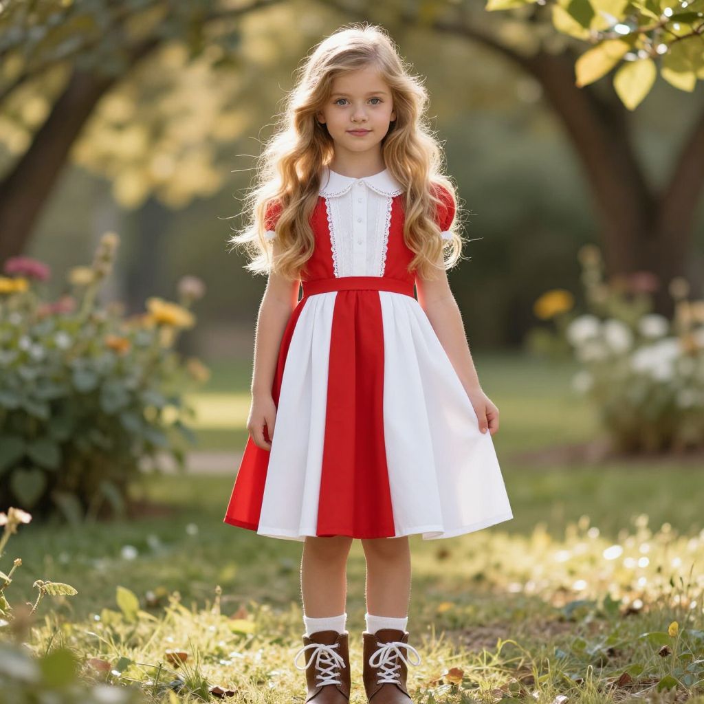 A beautiful young girl with soft blonde hair, gently flowing down her back, wearing a vibrant red polka dot dress with a delicate white collar and white socks that match the dress's clean, classic style. She stands in a sunny garden setting, smiling warmly with a serene expression, sunlight filtering through the trees, adding a golden glow to her hair and dress. The scene is softly lit, with a natural, charming atmosphere that highlights her innocence and elegance.