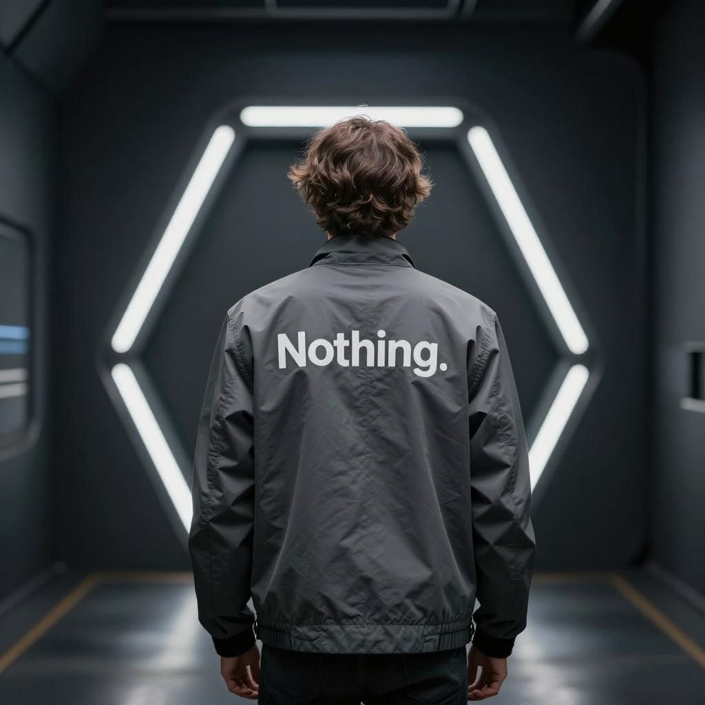 Man with medium-length brown hair stands with back to camera in dark, futuristic corridor. Wearing gray jacket with "Nothing" . Corridor has illuminated, geometric lighting on both sides. Triangular doorway ahead. Dark, industrial setting.
