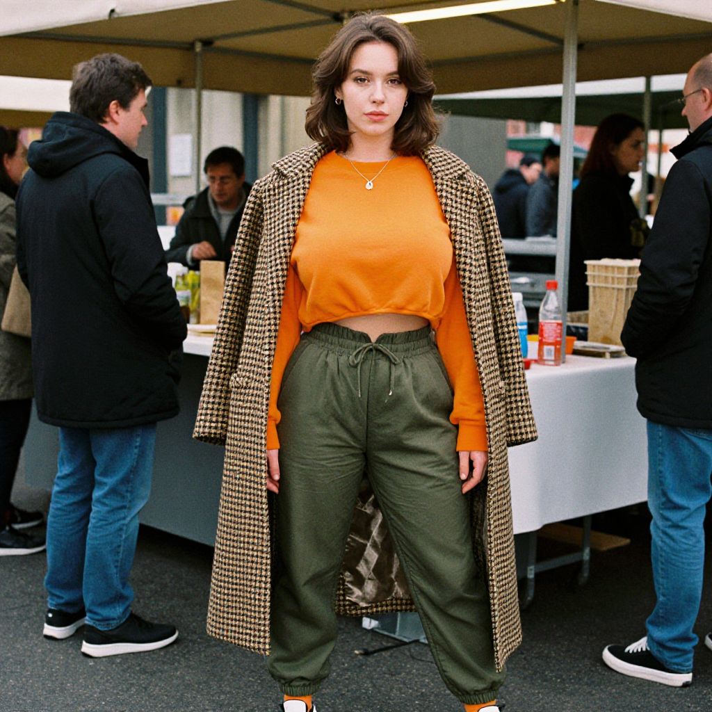 A woman, styled in technicolor analog film stock, wearing an orange cropped sweatshirt and a houndstooth coat, paired with olive green high-waisted joggers and black and white sneakers, standing at a street food market stall. Sexy. Pretty face and beаutiful eyes. Big breasts