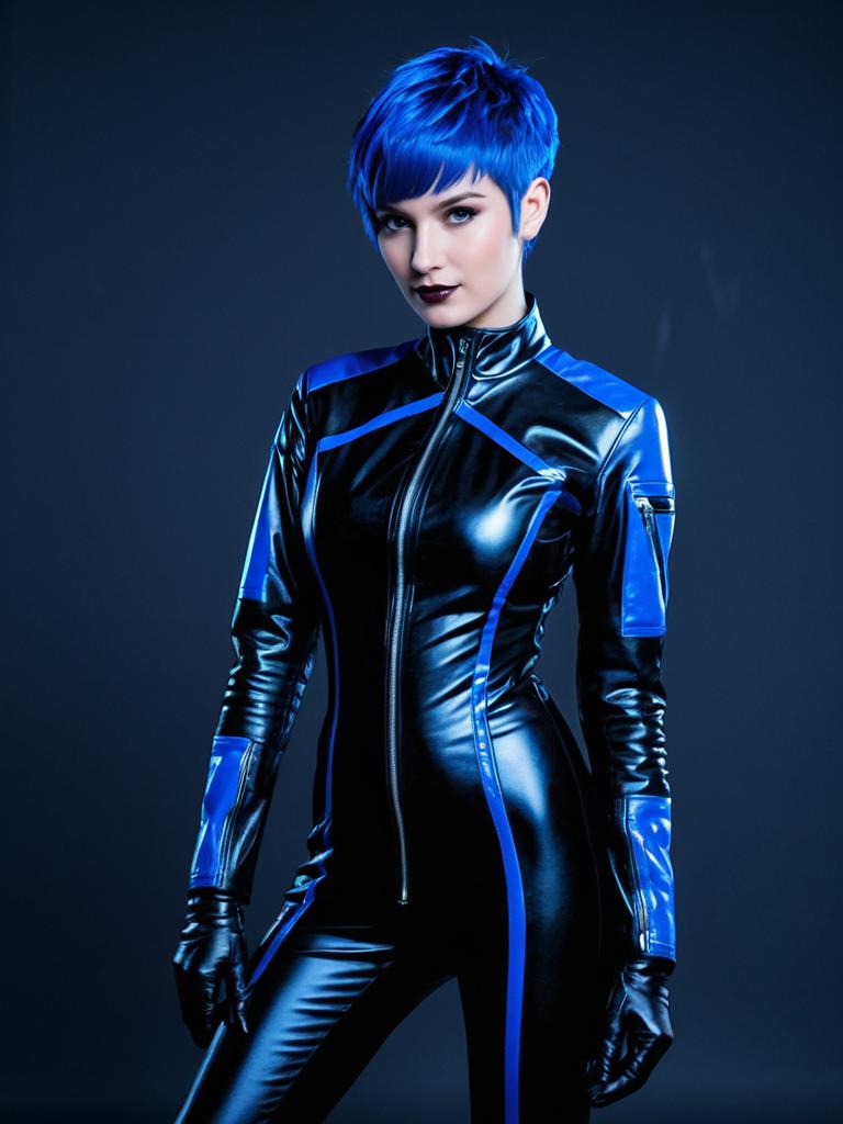 Image in the style of Synthwave, confident futuristic racer, short platinum hair, slender physique, (Leather & Latex Catsuit:1.3), metallic bodysuit with neon stripes, racing boots, glowing grid at night studio background