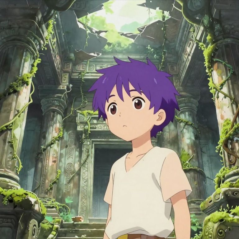 Anime purple hair boy exploring an ancient temple ruins covered in vines and moss, curious expression and soft ambient lighting filtering through broken ceilings, intricate background details in soft anime watercolor style