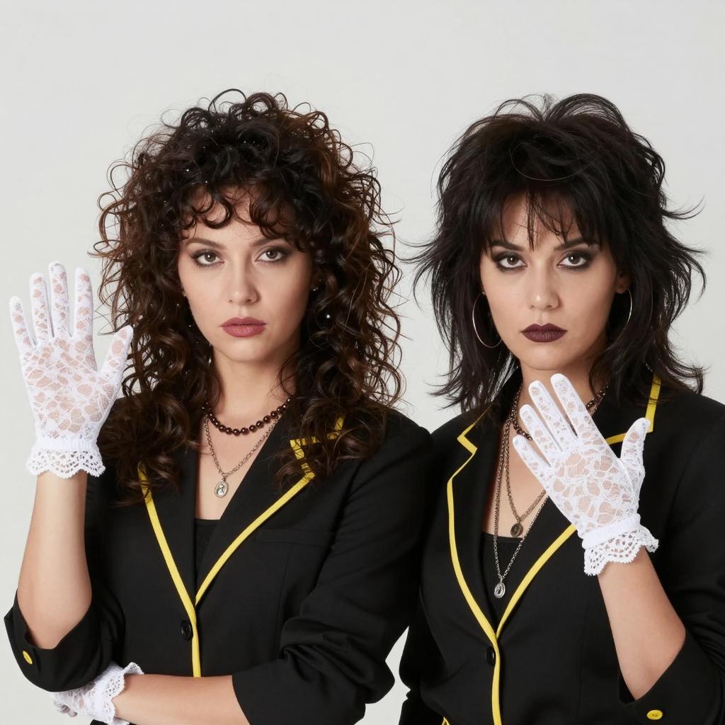 Two women with large, voluminous 80s hairstyles, wearing black jackets with yellow trim, white lace gloves, and layered necklaces. One woman on the left raises her hand, both have dark makeup and serious expressions. Background is plain white.