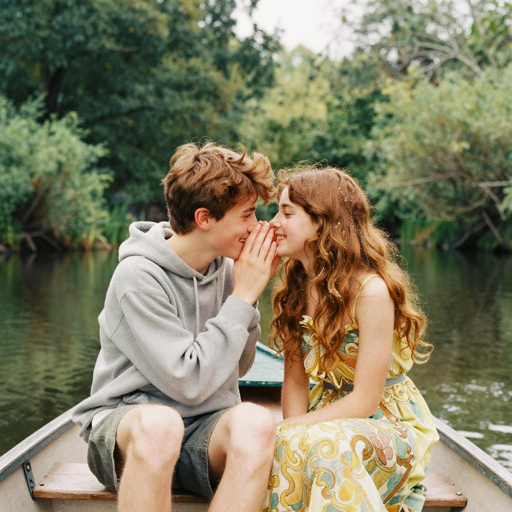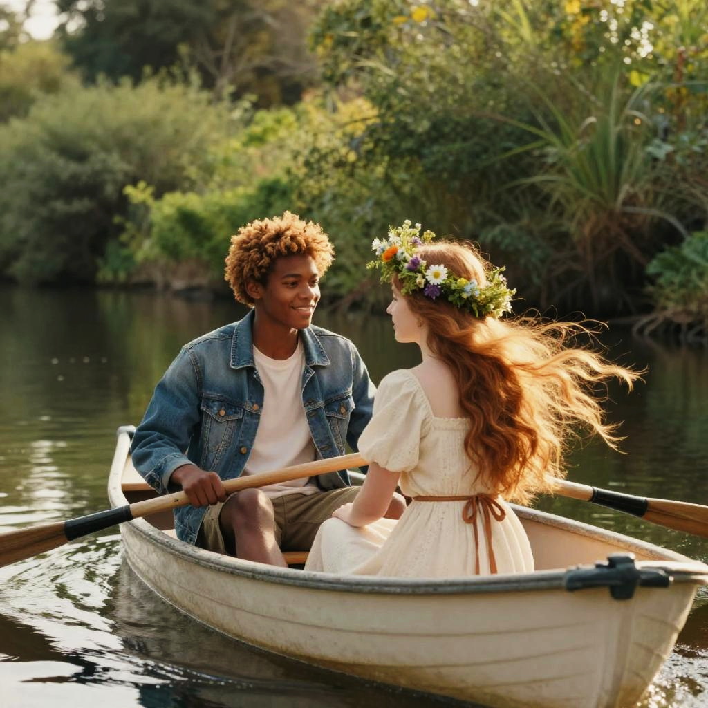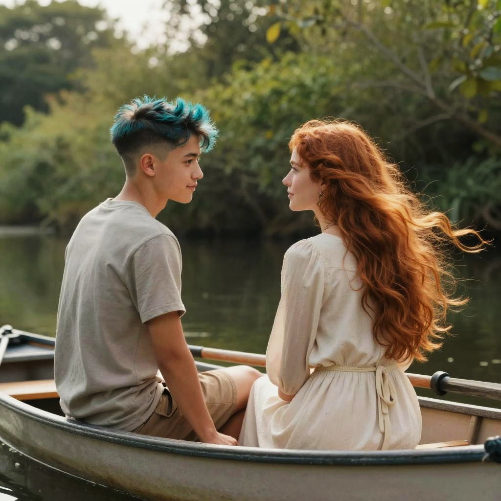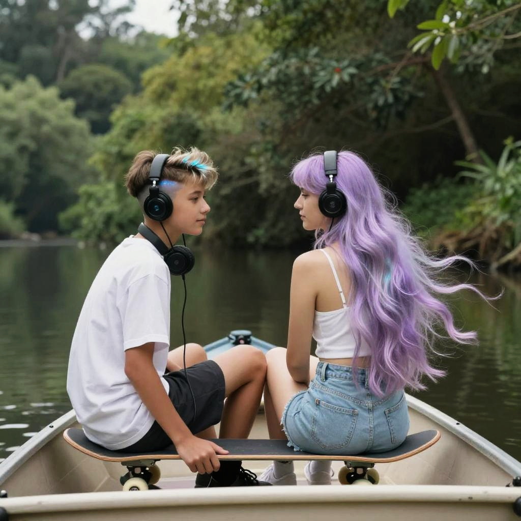 A teenage skateboarder boy with a holographic undercut and a woman with long flowing iridescent lavender hair are drifting peacefully while sharing headphones on a small rowboat, surrounded by lush greenery along a serene river. The boy has holographic undercut with silver and blue highlights while the girl has flowing locks that catch the light. Atmospheric lighting enhances the romantic mood, captured in a long shot that showcases intricate details in a style reminiscent of Albert Bierstadt, perfect for sharing on Tumblr.