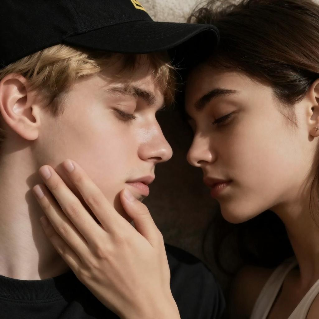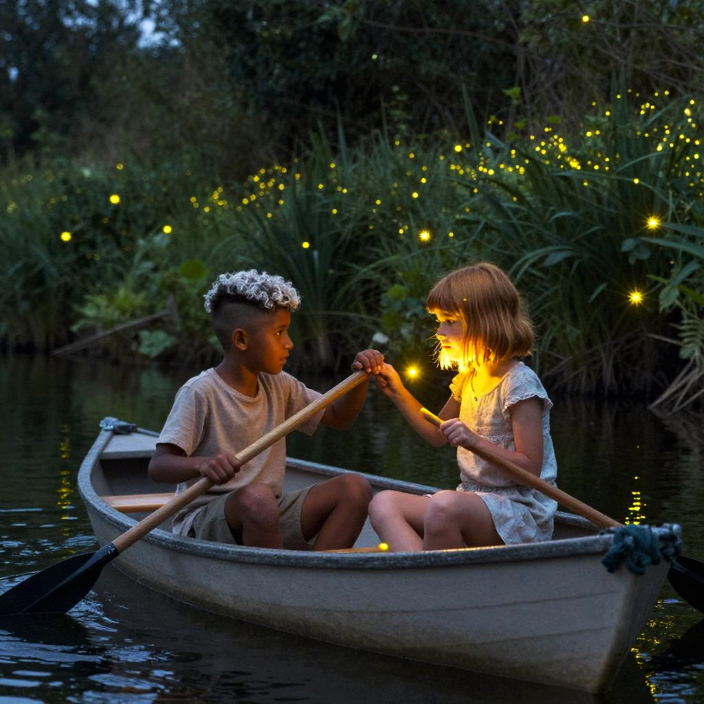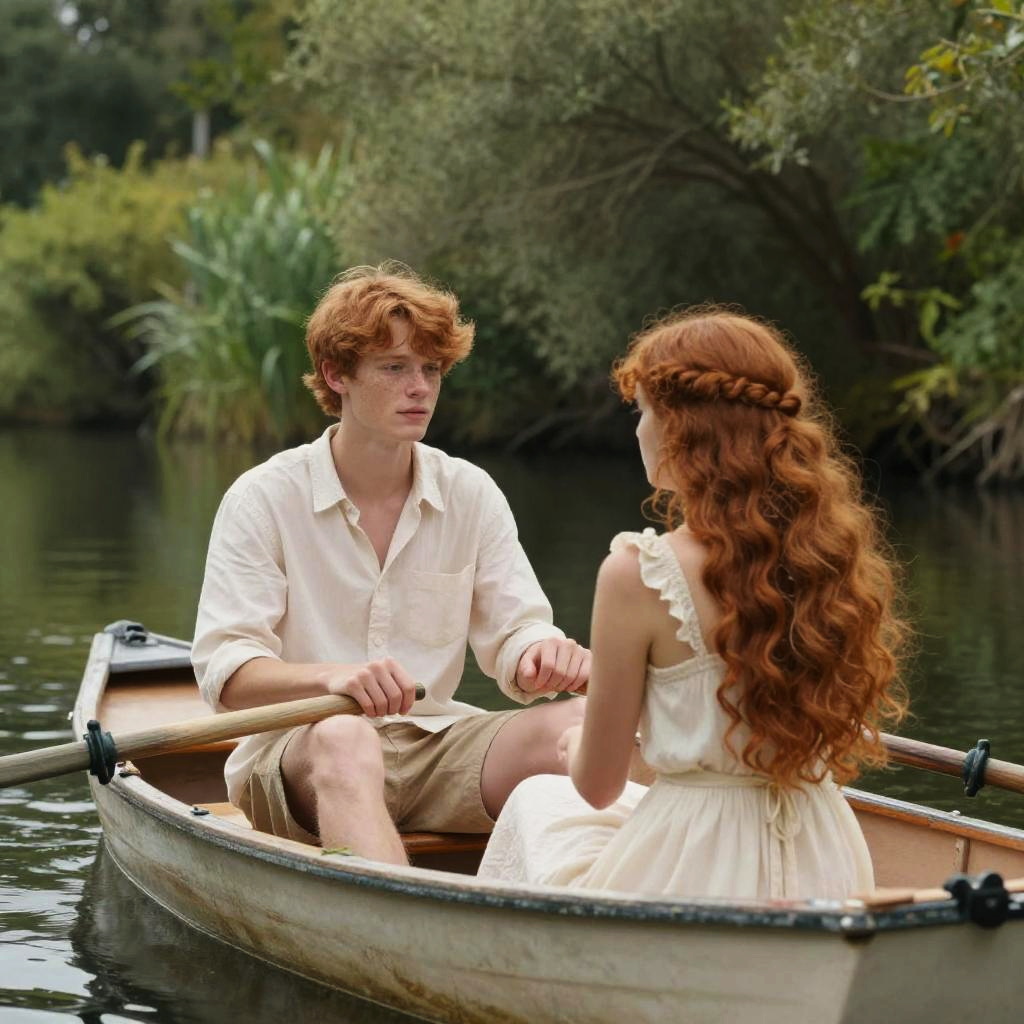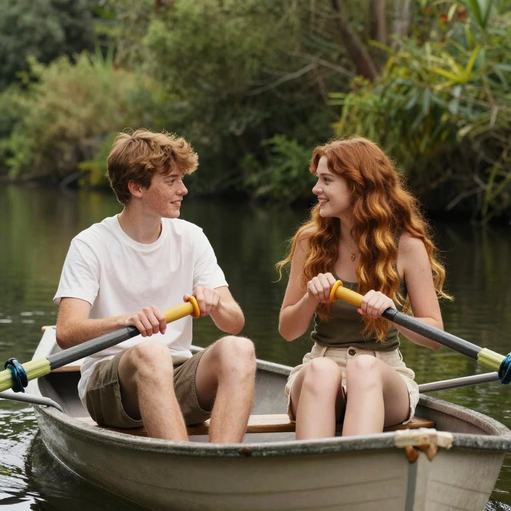 A teenage skateboarder boy with a holographic undercut and a woman with long flowing iridescent lavender hair are drifting peacefully while sharing headphones on a small rowboat, surrounded by lush greenery along a serene river. The boy has holographic undercut with silver and blue highlights while the girl has flowing locks that catch the light. Atmospheric lighting enhances the romantic mood, captured in a long shot that showcases intricate details in a style reminiscent of Albert Bierstadt, perfect for sharing on Tumblr.