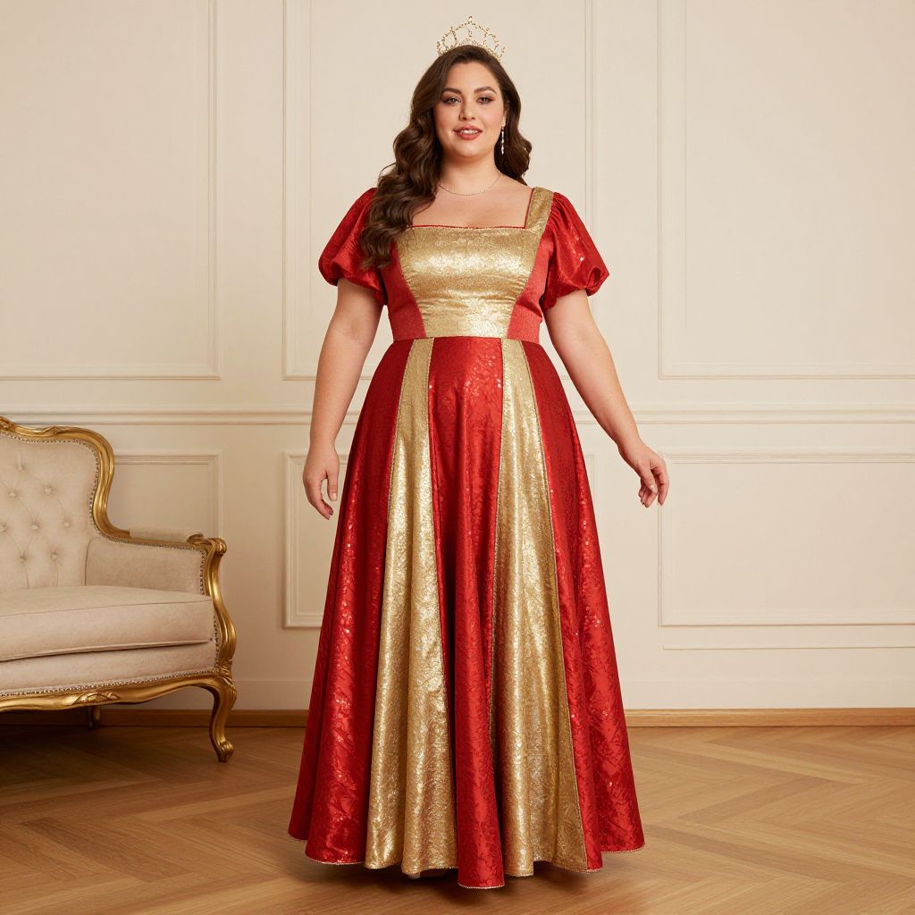 Plus Size Dress Costume, woman in a red and gold dress standing in a room
