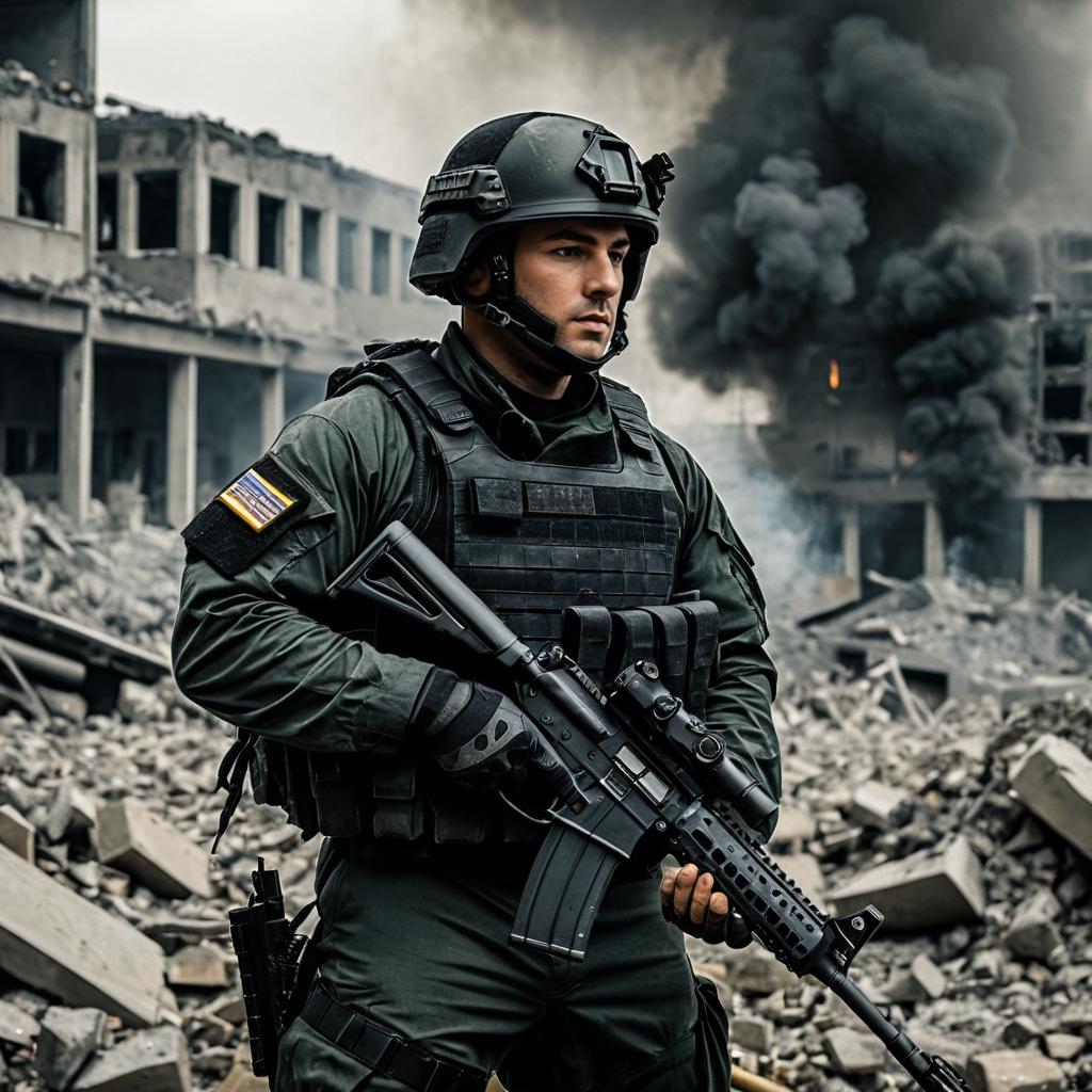 Soldier in Tactical Gear in Urban War Zone