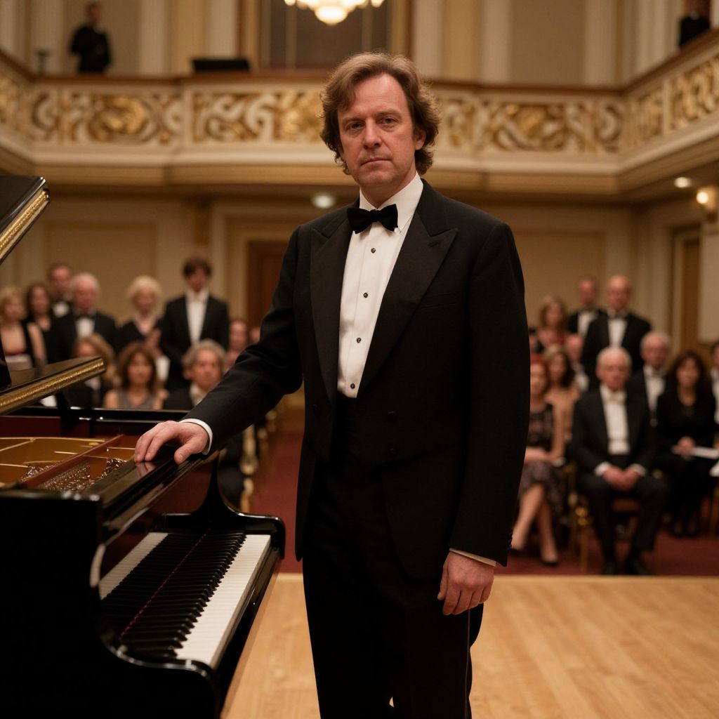 A gentleman in a classic black tuxedo, standing by a grand piano in a sophisticated music hall, with a crowd of elegantly dressed people in the background.