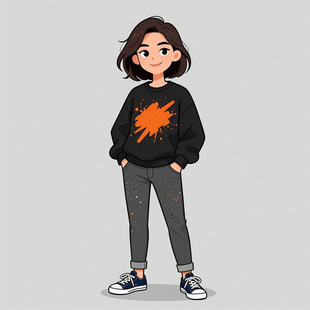 Woman with pretty face and pretty hair. smiling Man, streetwear, black sweatshirt with orange abstract splatter pattern, crew neck, long sleeves, grey slim-fit jeans with splattered paint details, navy blue and white canvas sneakers, hands in pockets, neutral studio background. --sref 1467