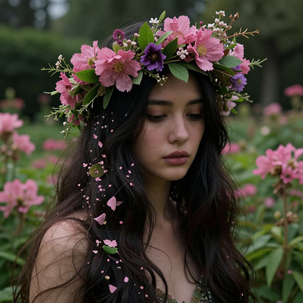 Photograph of a young woman with long, wavy black hair, wearing a floral crown adorned with pink and purple flowers, small white buds, and green leaves. She has a fair complexion and a serene, downcast expression. Her bare shoulders are visible. The background is a lush, green garden with blooming pink flowers. Small flower petals float around her head, adding a whimsical touch. The image has a soft, dreamy quality with a slight blur in the background, emphasizing the subject. The overall mood is ethereal and natural.