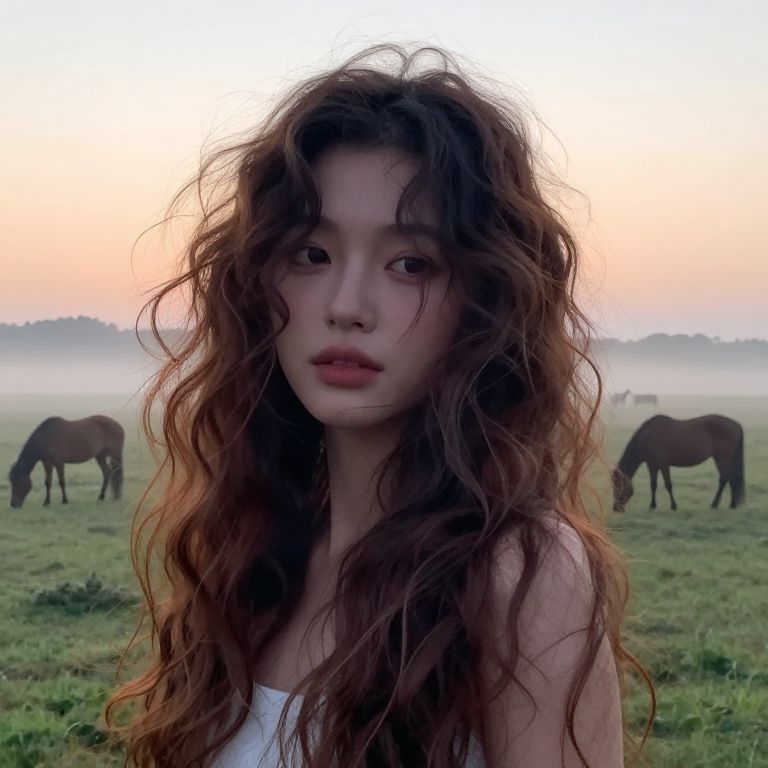 Horse girl hair illuminated by soft twilight, a mix of curls and straight strands loosely framing the face, gentle breeze adding movement, surrounded by a misty meadow with horses grazing in the background, dreamy and ethereal pastoral atmosphere